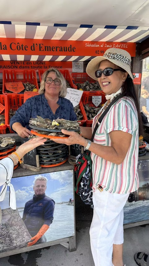 時間就這樣不知不覺的度過,十一點司機開大巴來接我們到另一邊海濱養蠔場Cancale(坎卡萊)城去,廿分鐘左右,我們到了養蠔場,拍照留念,這時去「聖米歇山」的年輕晚輩來與我們在養蠔場會合(中午是水漲期間,水淹蠔場,我們沒有看到養蠔場),但有早上水未漲時的被撈鮮蠔可以買來吃,不少同學各買一盤十二只生蠔9€一杯白酒2.5€來過過吃海鮮癮,也有人怕鬧肚子不敢吃生蠔,等中午去餐廳吃熱盤。